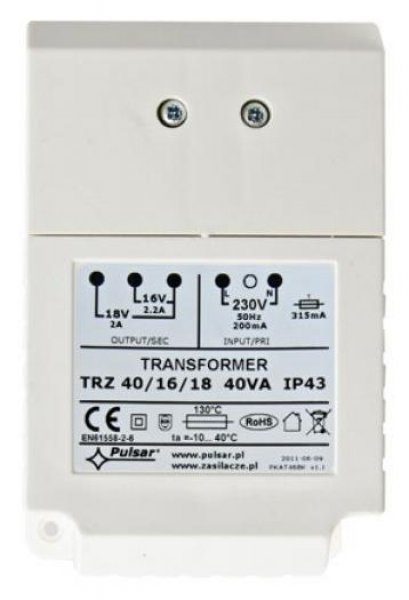 transformátor 230 V AC/16/18 V AC (40 VA), kryt z polykarbonátu, IP43| Značka: | PULSAR | P/N: | AWT 468 |